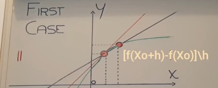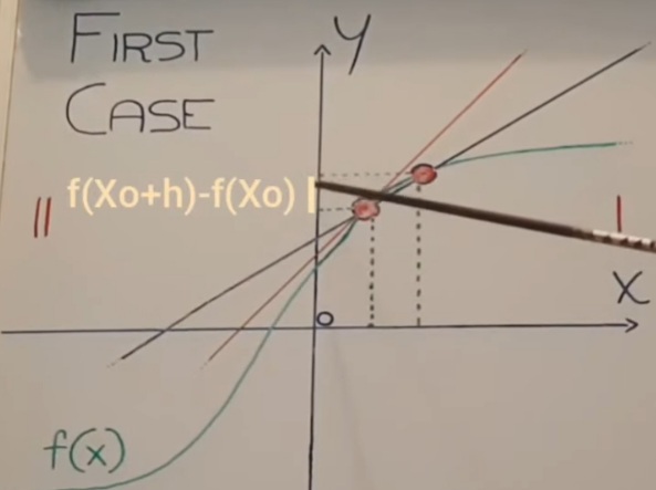 and “[f (Xo + h ) – f (Xo)] ” is understood as ” Delta y “, with ” f (Xo + h) ” and ” f (Xo) considered respectively as the images on the axis of the ordinates of the two extreme points in denominator, with h tending to 0.