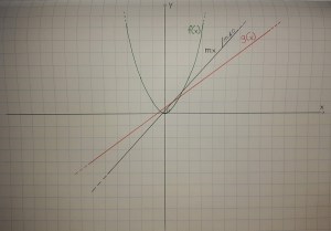 Ipotizziamo ora che la funzione scelta a priori abbia un diverso grado polinomiale e che, per esempio, abbia come numeratore una funzione parabolica di grado polinomiale uguale a 2 ed a denominatore una funzione retta, sempre con inclinazione non nulla ed intersezione con l’asse y, di grado polinomiale uguale ad 1. Sviluppando graficamente il loro rapporto otteniamo come risultato una retta generica completa, la cui inclinazione, ovviamente, risulta un valore numerico puntuale m, corrispondente al suo coefficiente angolare ed al suo valore di derivata.