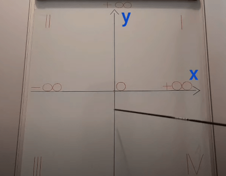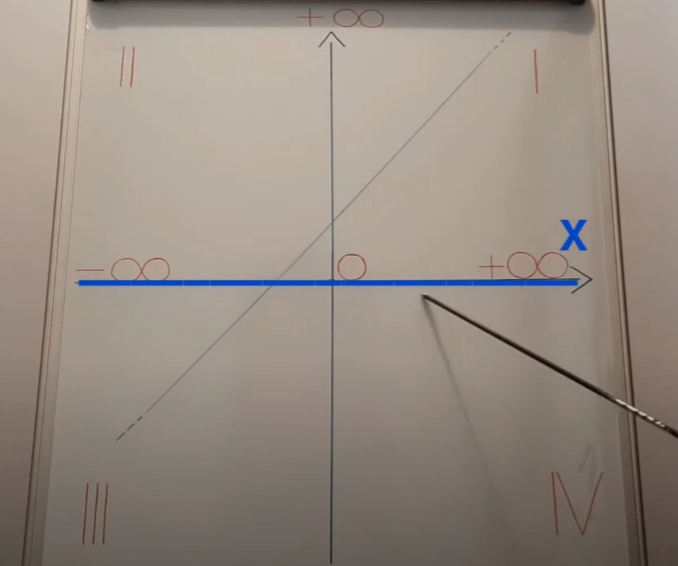 Ognuno dei due assi che tagliano il piano bidimensionale, intesi come retta, dunque come insieme infinito di punti che si susseguono in maniera ordinata, per cui ogni punto segue il precedente e precede il seguente lungo una ed una sola direzione, munita di verso e sprovvista di modulo, (non misurabile poichè infinita), si sviluppa a partire dal valore “meno infinito”, intersecando l’altro asse nel punto di origine degli assi, in cui le coordinate cartesiane risultano rispettivamente (0;0), per poi muoversi, sempre in maniera rettilinea, verso “più infinito”.