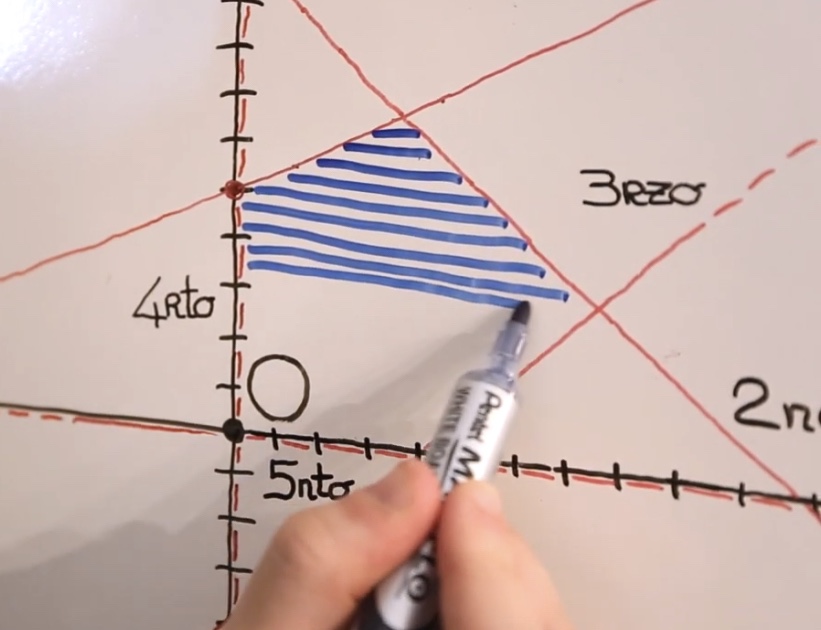 Per ogni disequazione, che sia legata ad un vincolo generico o ad un vincolo specifico, occorre ora andare a “colorare” sul piano cartesiano le aree di soluzione associate, considerando il segno della nostra disequazione. Ricordiamo come i vincoli generici siano riferiti all’esistenza delle soluzioni solo in alcuni quadranti del piano cartesiano, mentre i vincoli specifici sono legati alla specifica traccia dell’esercizio.