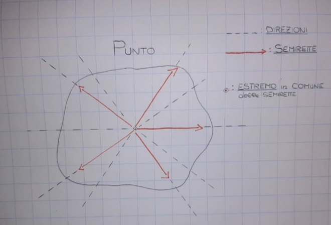 Proponendo una nuova definizione di “punto“, (ricordando i concetti di infinito ed infinitesimo), esso può essere inteso come la figura geometrica sommatoria pluridimensionale di infinite infinitesime semirette, giacenti lungo infinite direzioni ed aventi un estremo in comune, nell’infinitesimo istante temporale in cui essa tende ad una coordinata vuota dello spazio in cui è rappresentata.