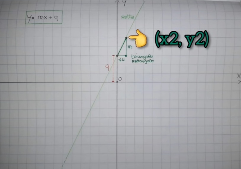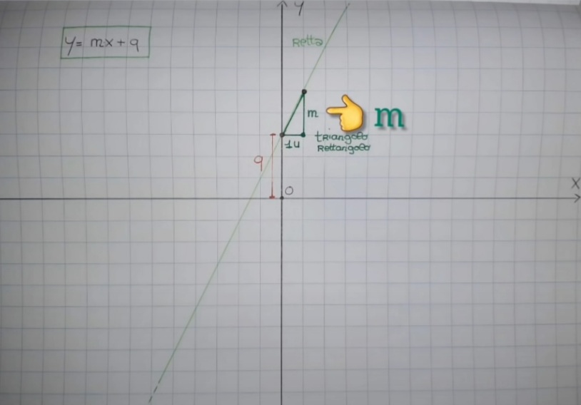In questi termini, data la sua equazione, per disegnare la retta non sarebbe più necessario utilizzare la tabella dei punti (x,y), ma unicamente il valore del coefficiente angolare “m”, per cui, considerando come primo punto “q” e come secondo, se m>0, l’estremo di ordinata maggiore del cateto verticale e, se m<0, l’estremo di ordinata minore dello stesso cateto verticale, si sarebbe subito in grado di tracciare la retta passante per tali due punti.
