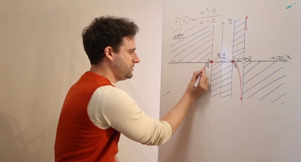 Siamo arrivati alla fine del nostro esercizio: ecco l’ultimo punto, l’atto conclusivo del nostro lavoro, ovvero il disegno del grafico della funzione sul piano cartesiano. Avendo ora tutte le informazioni e le coordinate utili, nel dettaglio, possiamo finalmente completare l’opera e redigere il grafico il maniera completa.
